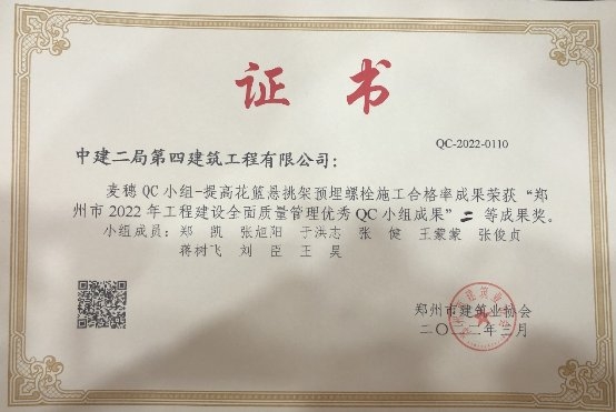 在全力以赴保進度的前提下,由項目經理鄭凱牽頭,各部門高效協同,始終不忘初心,牢記中建“品質保障,價值創造”的核心價值觀,對施工質量嚴格把控,一絲不茍。該項目獲得了“鄭州市2022年工程建設全面質量管理優秀QC小組成果”二等成果獎的優異成績。