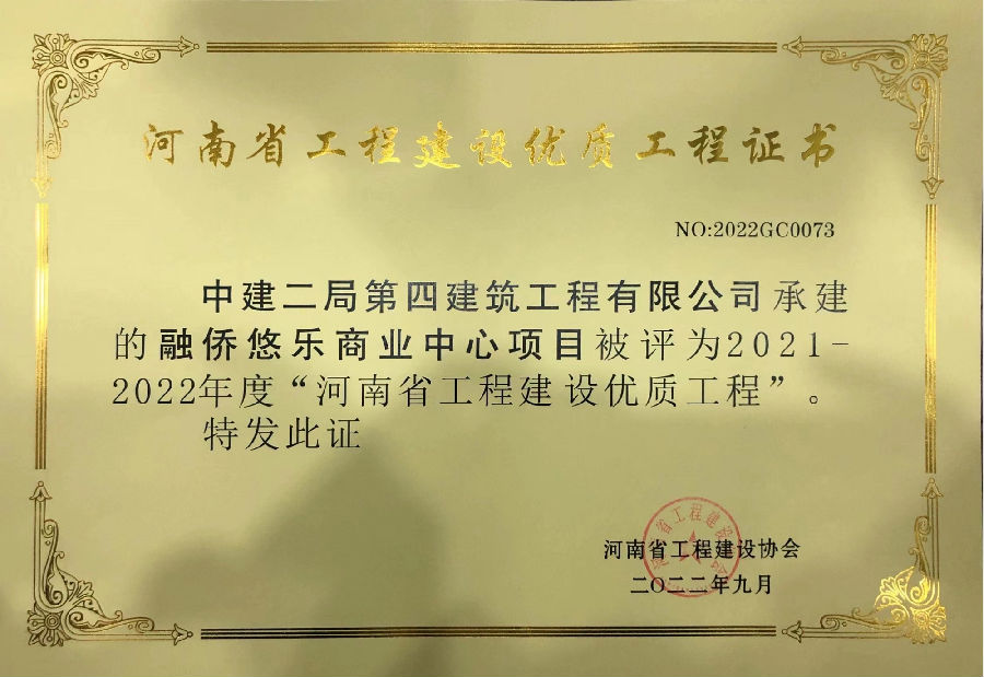 近日,公司華中分公司鄭州融僑悅瀾庭項(xiàng)目榮獲河南省工程建設(shè)優(yōu)質(zhì)工程證書(shū)。據(jù)悉,河南省工程建設(shè)優(yōu)質(zhì)工程獎(jiǎng)是河南省工程建設(shè)行業(yè)工程質(zhì)量的高等級(jí)榮譽(yù)之一,評(píng)選標(biāo)準(zhǔn)接軌國(guó)家優(yōu)質(zhì)工程獎(jiǎng),此次獲獎(jiǎng)為項(xiàng)目部爭(zhēng)創(chuàng)“國(guó)家優(yōu)質(zhì)工程獎(jiǎng)”打下堅(jiān)實(shí)基礎(chǔ)。