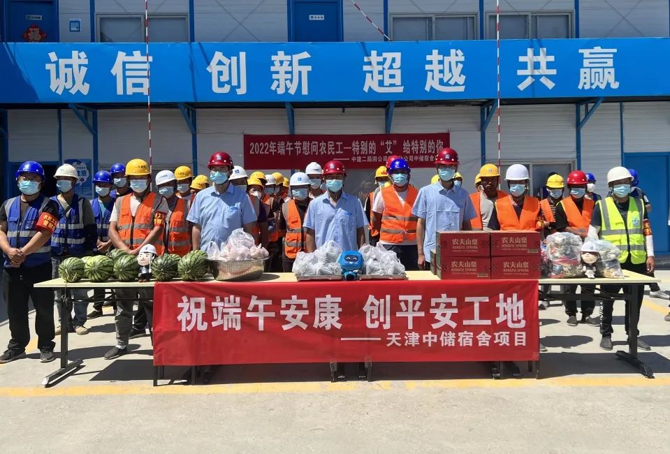 華北分公司天津中儲宿舍項目舉辦“特別的‘艾’給特別的你”慰問農民工活動。項目員工將親手制作的印有“平平、安安”等吉祥物圖案的艾草香包及西瓜、礦泉水、粽子、雞蛋等物品送給持續奮戰在施工現場的三百余名一線工人,讓農民工兄弟們度過一個溫情涌動的端午節。