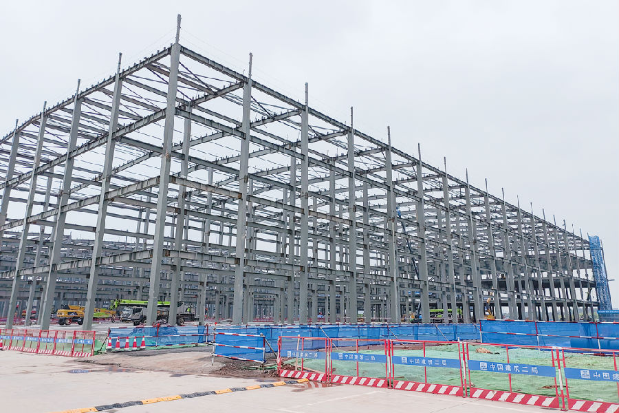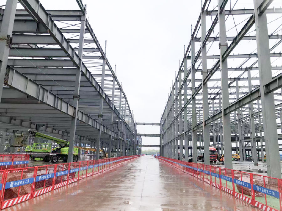 高效穿插:項目在開工初期,第一時間制定了主體結構、鋼結構、外圍護及地坪、市政工程等多作業面流水穿插施工方案。市政過路管線提前預埋,通過正式路、臨時路之間的轉換,以永臨結合的方式實現市政工程穿插施工。主體施工階段合理劃分施工段,進行分段流水施工,主體拆模后及時插入二次結構施工。鋼結構施工與結構地坪穿插施工,預留吊車行走通道。外圍護與地坪分段流水作業,實現相互穿插,互不影響。
