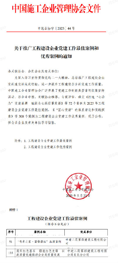 近日,中國施工企業(yè)管理協(xié)會印發(fā)了《關于推廣工程建設企業(yè)黨建工作最佳案例和優(yōu)秀案例的通知》的通知,公司《“青年之家·雷鋒驛站”品牌案例》獲評工程建設企業(yè)黨建工作最佳案例,東北分公司《筑牢紅色基石 鍛造紅色先鋒 以高質量黨建推動企業(yè)高質量發(fā)展》獲評工程建設企業(yè)黨建工作優(yōu)秀案例。