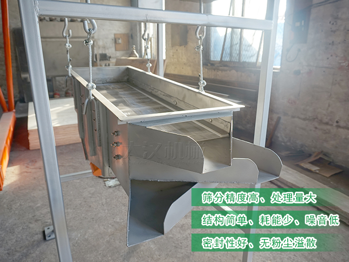 整個設(shè)備由篩箱、網(wǎng)架、篩網(wǎng)、2臺臥式振動篩電機、減震彈簧、進出料口、上蓋組成,除此之外還有高度可按需求定制的支架通過四個吊鉤把整個設(shè)備吊掛起來使其處于懸空狀態(tài)。
